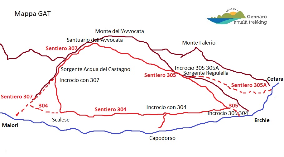 Maiori Capodorso (170 m) – Scalese (260 m) – Santuario dell’Avvocata (870 m) – Incrocio Sentieri 305 e 304 (260 m) – Maiori Capodorso (170 m)